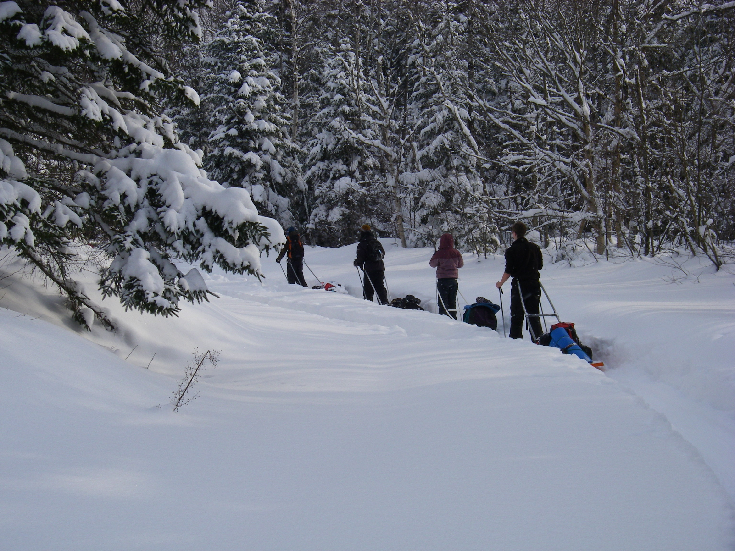 Une nouvelle activité a vu le jour cette année en plein air II. En effet, les élèves ont eu la chance de réaliser un camping hivernal dans la region de Portneuf avec skis de fond hors-piste et pulka. Cette dernière leur a permis de transporter avec un effort moindre qu’en sac à dos, une bonne quantité de bagages. Cette combinaison skis-pulka est le véhicule d’exploration le plus employé par les explorateurs de l’arctique et de l’antarctique (François-Guy Thivierge, Bernard Voyer, etc.) Mentionnons également que les élèves ont eu à construire leur propre pulka à partir d’un traîneau de plastique et d’un harnais en pvc.