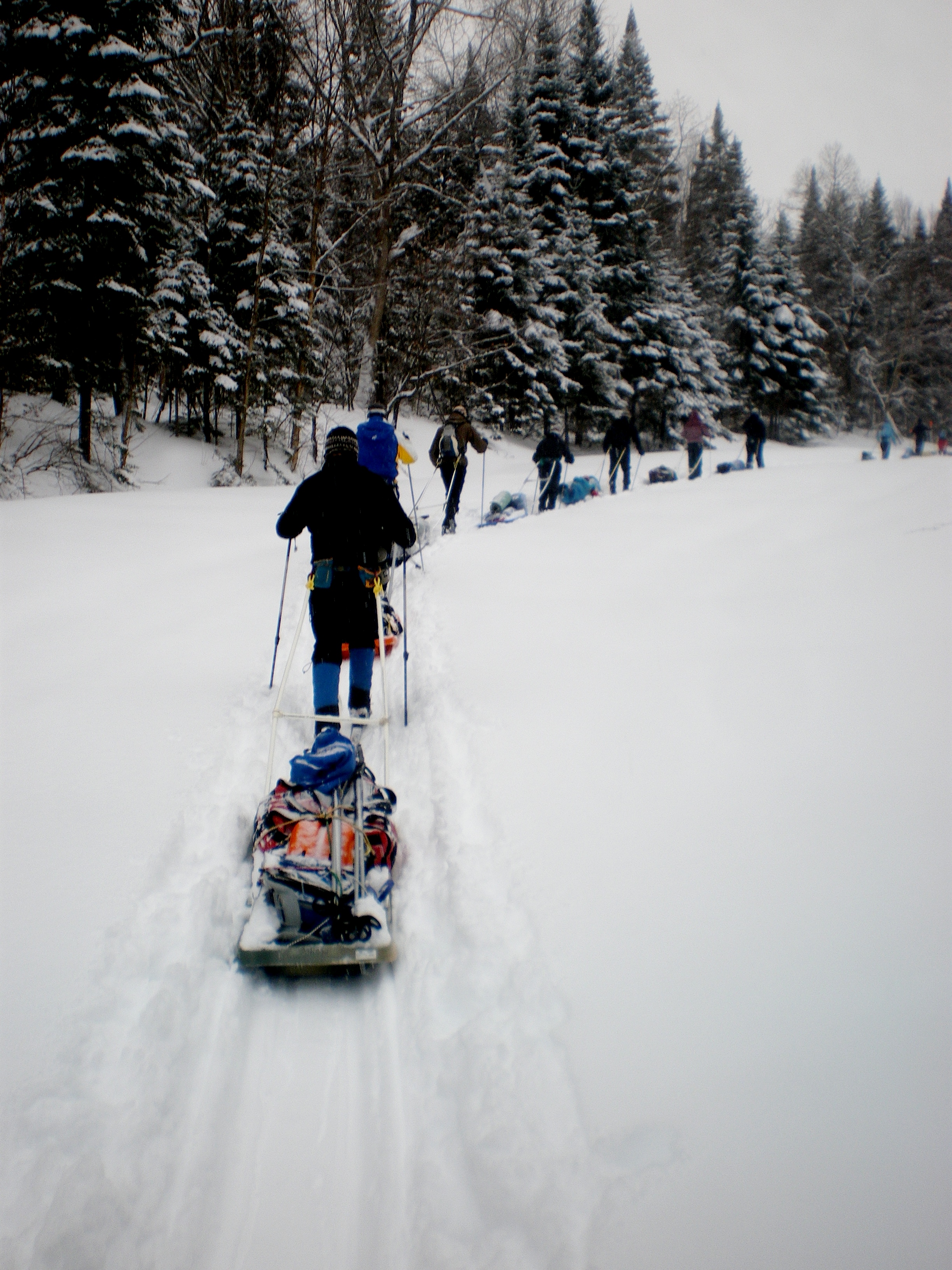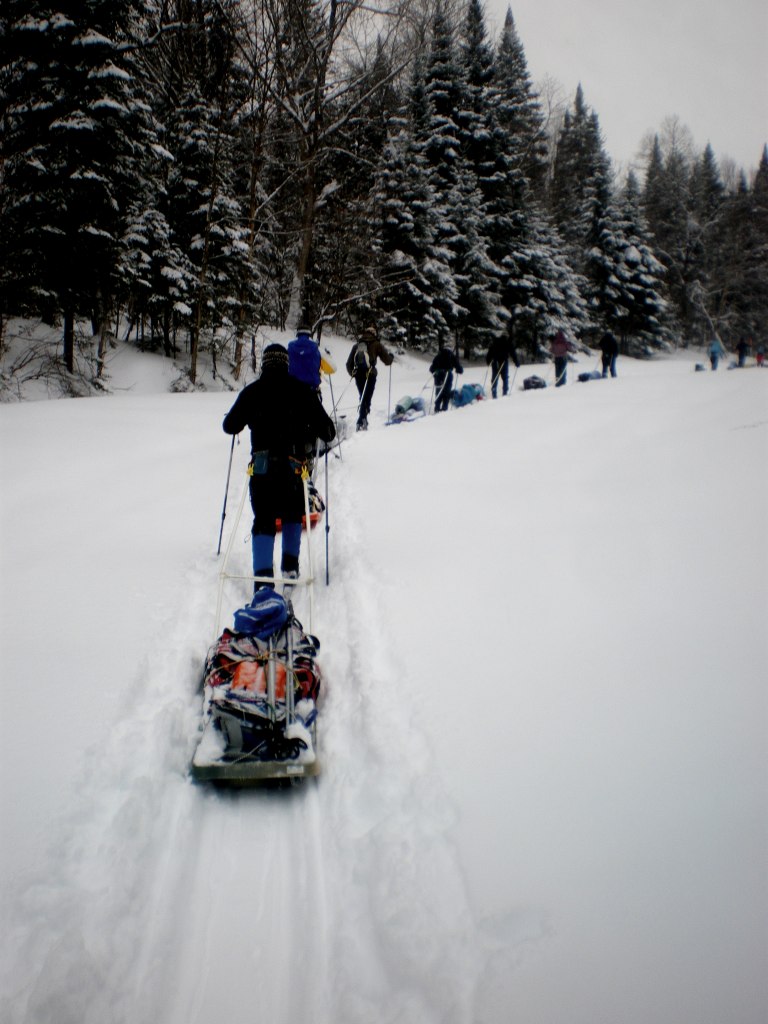 Une nouvelle activité a vu le jour cette année en plein air II. En effet, les élèves ont eu la chance de réaliser un camping hivernal dans la region de Portneuf avec skis de fond hors-piste et pulka. Cette dernière leur a permis de transporter avec un effort moindre qu’en sac à dos, une bonne quantité de bagages. Cette combinaison skis-pulka est le véhicule d’exploration le plus employé par les explorateurs de l’arctique et de l’antarctique (François-Guy Thivierge, Bernard Voyer, etc.) Mentionnons également que les élèves ont eu à construire leur propre pulka à partir d’un traîneau de plastique et d’un harnais en pvc.